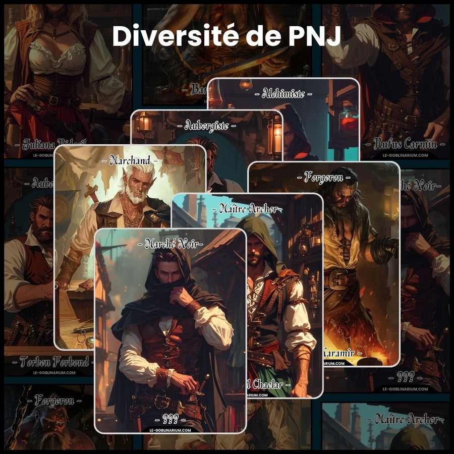 De l'aubergiste amical au mystérieux marchand du marché noir, chaque carte ajoute une nouvelle dimension à vos aventures. Créez des interactions mémorables et plongez vos joueurs dans un monde vivant et dynamique.