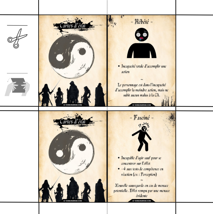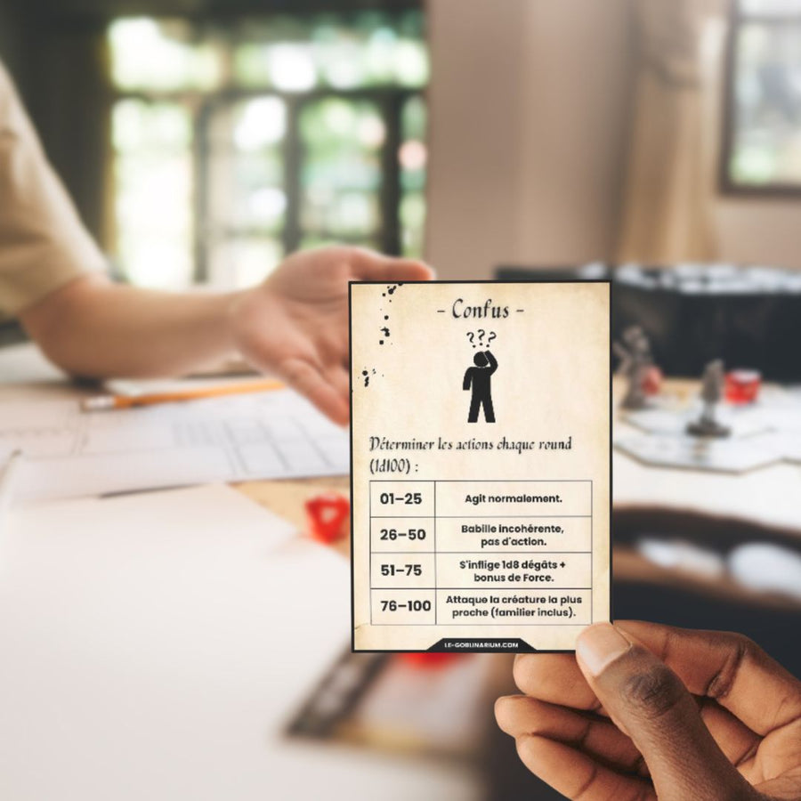 Lors d'un combat intense, un joueur subit l'effet de l'état "Confus". Le MJ lui donne immédiatement la carte "Confus". Le joueur peut alors lire directement sur la carte les actions possibles (tirer 1d100 pour déterminer son comportement), les malus, et les effets sans avoir à interrompre le flux du jeu pour consulter le manuel. Cela permet non seulement de gagner du temps, mais aussi d'assurer que tous les effets de l'état sont correctement appliqués.
